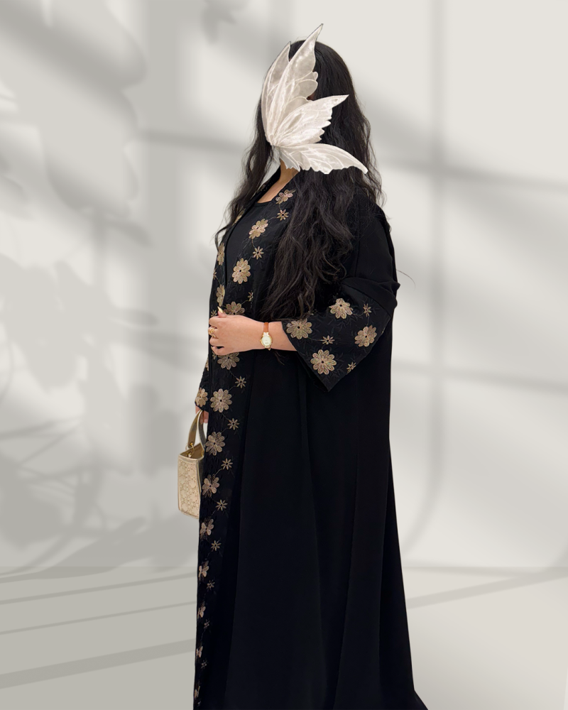 - تطريز ذهبي يدوي يعكس جمال الزهور المتناسقة التي تزين الأكمام والحواف.