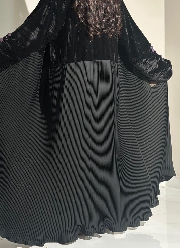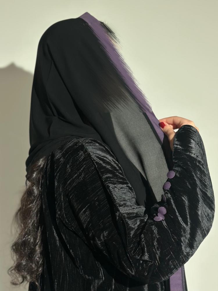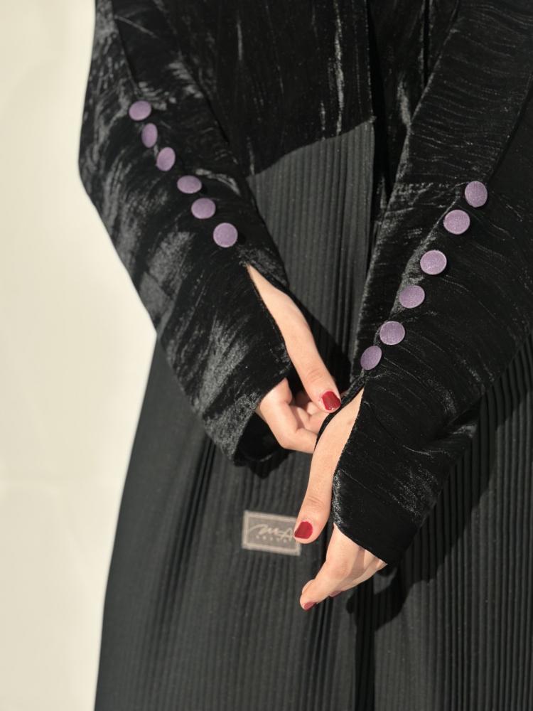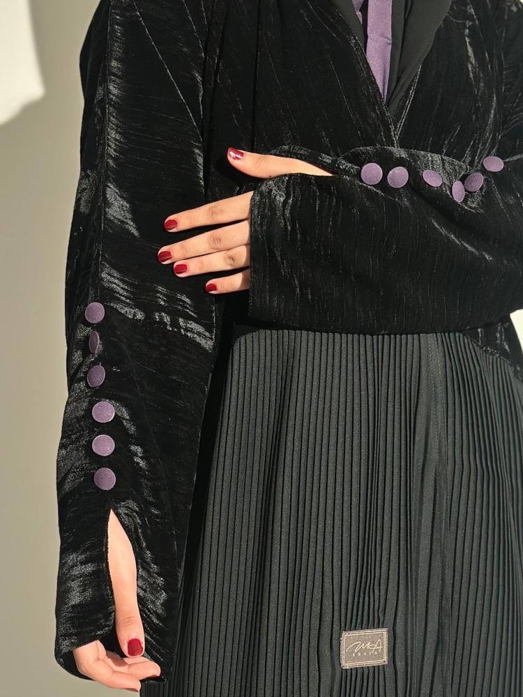 مصمّمة من قماش مخملي فاخر يعكس لمعانًا ناعمًا تحت الضوء، مزدانة بأزرار بنفسجية تضيف لمسة أنوثة راقية تميّزها عن غيرها.