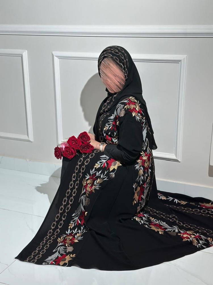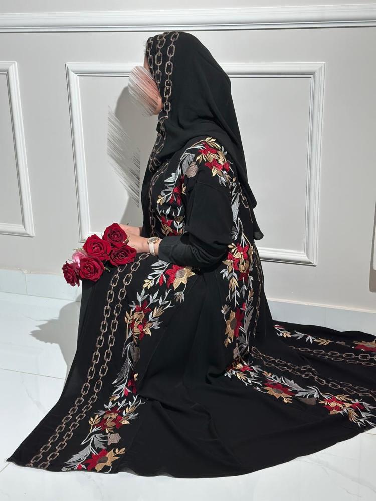 • تطريز انيق فاخر بألوان الأحمر، الذهبي، والفضي يمنح العباية لمسة راقية.