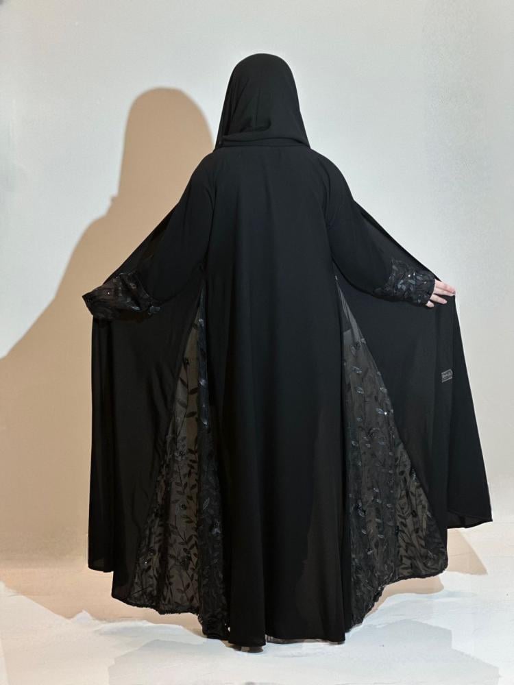 • تمتاز العباية بتطريز أوراق فني يمنح الهيكل العام لمسة طبيعية حيوية تعكس الأناقة الهادئة.